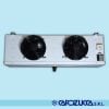 Aeroevaporador de doble flujo tipo plafón para cámaras frigoríficas o salas de trabajo en media temperatura. Construido en caños de cobre de 1/2″ con aletas de aluminio corrugadas de cuello profundo con una separación de aletas de 4,5 mm. Son recomendados para cámaras con una temperatura interior de hasta -5 ºC. Se pueden proveer a solicitud del cliente con o sin descongelamiento eléctrico.
